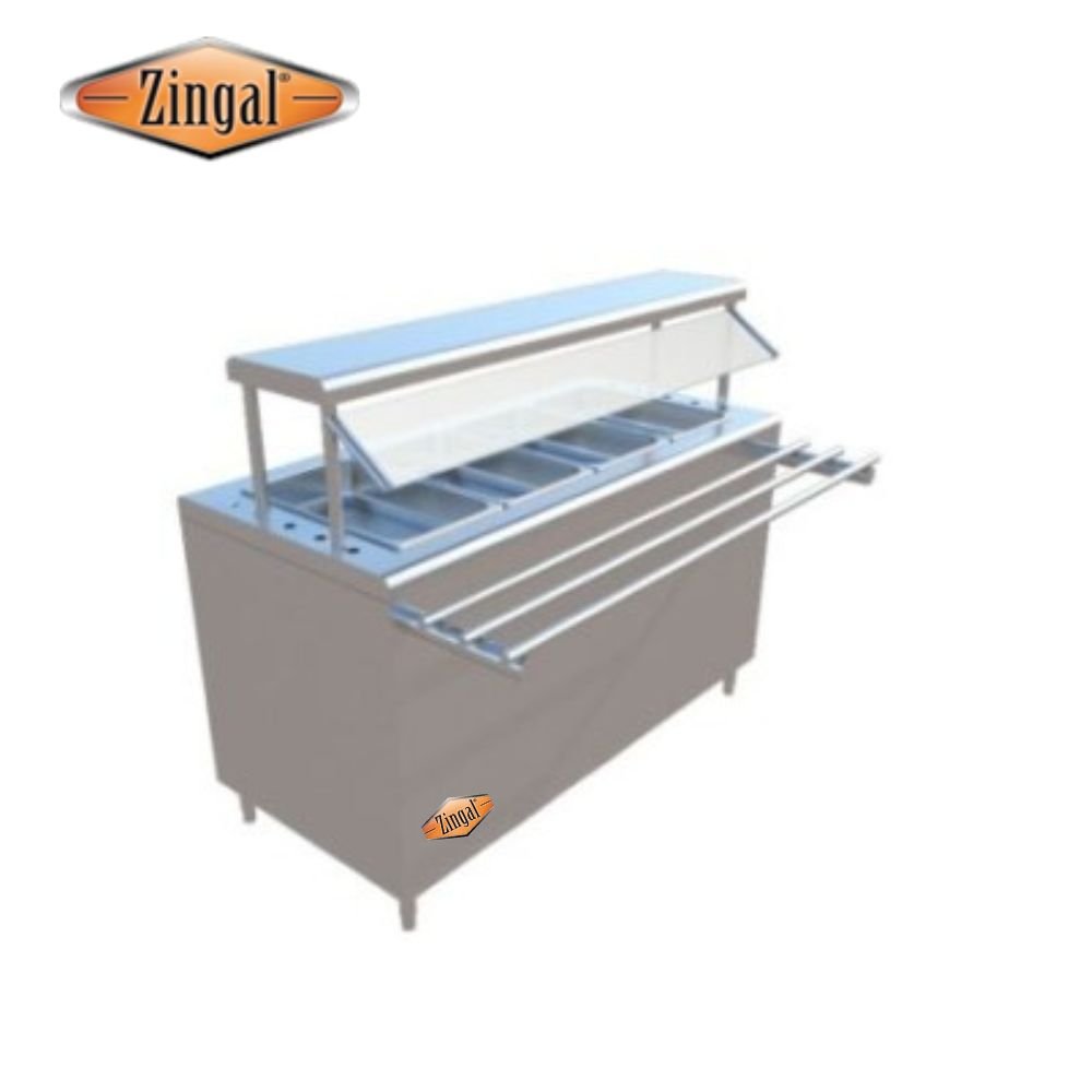 Autoservicio marca Zingal para calentar alimentos tipo baño de Maria, funcionamiento a gas o eléctrico, utiliza azafates enteros, viene con sistema de pasa bandejas y vitrina anti estornudo, optimo para servir alimentos en comedores y cocinas industriales, su fabricación en acero inoxidable lo hace de gran durabilidad, bonita presentación, se fabrica en Bogotá y se vende en toda Colombia ref A1.