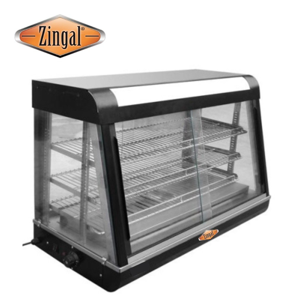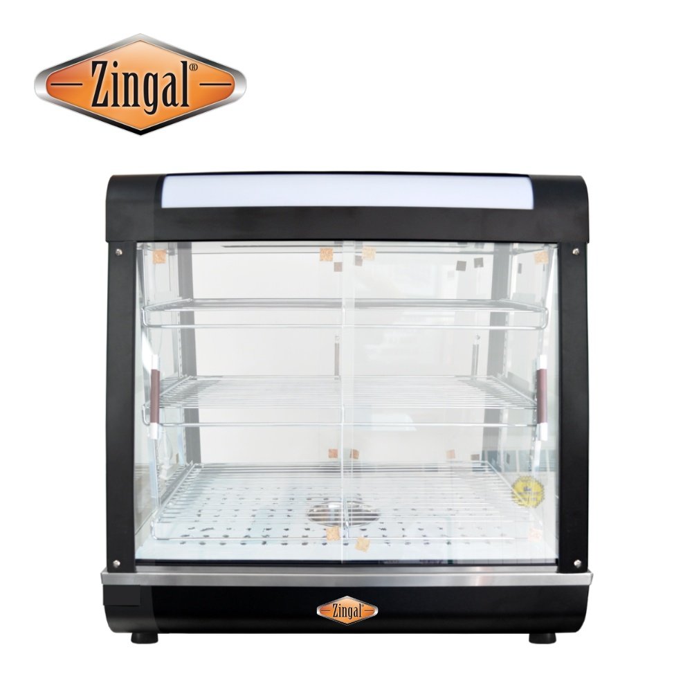 Vitrina térmica marca Zingal, Vitrina caliente para cafeterías, panaderías, restaurantes o cualquier sitio que requiera exhibir alimentos bien conservados como sushi caliente, pollo rostizado, pollo a la brasa, pizza, churros, tortillas o pan. fabricada en acero inoxidable, con acabado exterior negro, puertas en vidrio templado para mayor seguridad y mejor exhibición de los alimentos, parrillas ajustables en acero, control de humedad (azafate para agua), Iluminación led (Botón de encendido para iluminación), control para ajuste de temperatura (30-90°C). Dimensiones: Frente 64 cm Fondo 49cm Alto 64cm. Se vende en Bogotá y se distribuye en toda Colombia. Ref: CR2