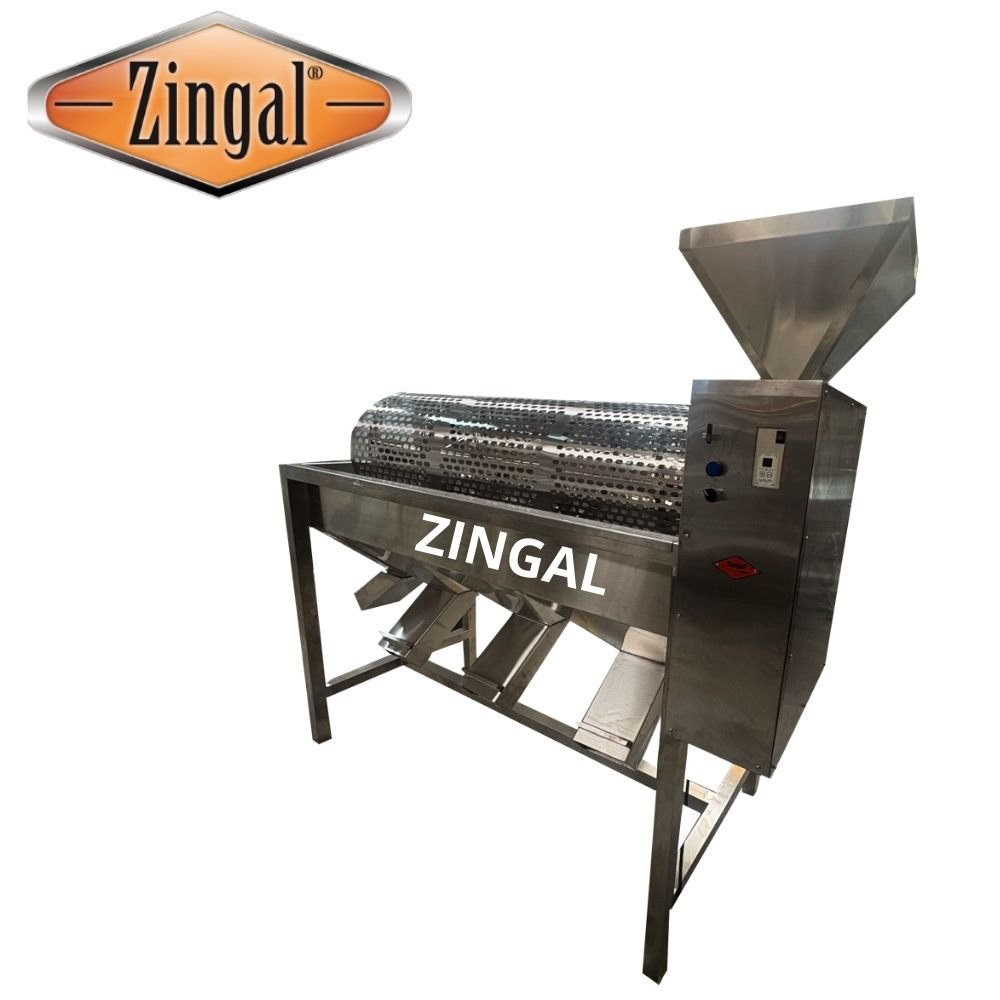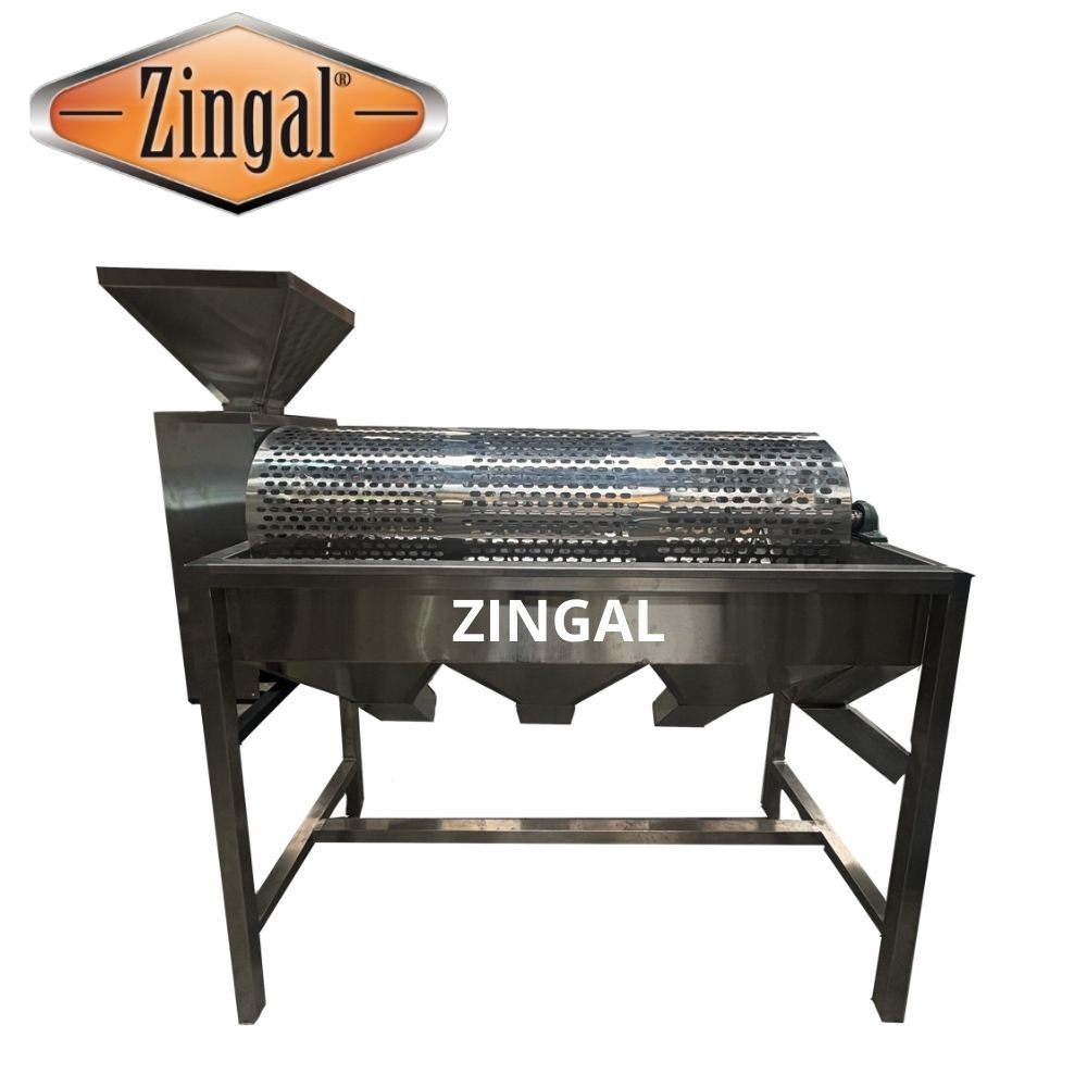 Nuestra zaranda clasificadora para 500 kg/hora de cilindro horizontal giratorio esta fabricada en acero inoxidable 304 antiácidos, apto para el manejo de alimentos, tanque fabricado en lámina de acero inoxidable troquelada. El equipo cuenta con 3 niveles de clasificación y una salida final para los más grandes (es decir, 4 clasificaciones), equipo con una capacidad de producción de 300 kg por hora, cada una de las cuatro (4) bandejas receptoras cuenta con su sello o tapa para controlar la caída del producto, este equipo es de gran utilidad en las plantas procesadoras de cacao, ya que permite realizar una clasificación rápida y homogénea de los granos de cacao, es fabricada en Bogotá por Zingal y vendida en toda Colombia ref: CH2